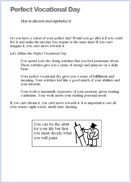 After you have completed this “workshop-in-a-book”, you will have defined your Perfect Vocational Day™ and you will have a step-by-step process that will allow you to live it!